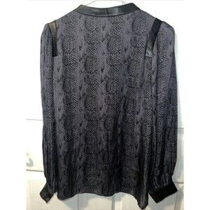 Elevate your wardrobe with this stylish PAIGE Adeli top in Dark Night. Featuring a V-neckline, button closure, and long sleeves, this blouse is perfect for any occasion. The animal print pattern and faux leather accents add a touch of sophistication to this piece, while the polyester material ensures comfort and durability. The shirt length can be seen in the provided pictures.