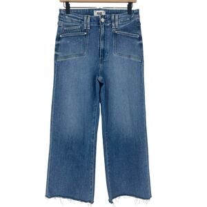 The PAIGE Anessa High Rise Wide Leg Jeans in Bebop are the perfect blend of modern comfort and vintage flair. Designed with a flattering high-rise fit, cropped raw hem, and wide-leg silhouette, these jeans give off effortless California-cool vibes. The patch front and back pockets add a utilitarian touch, while subtle fading and whiskering create that perfectly lived-in look. Crafted from a soft cotton blend with just the right amount of stretch, these jeans move with you and hold their shape all day. Style them with a tucked-in blouse, cropped sweater, or heeled boots for a polished yet relaxed look.