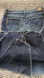 Edgy distressed/ asymmetrical denim skirt with frayed patchwork. Perfect for a bold look. Pockets, zip front, one button design front. slit design lower front. Size 29 waist or Medium. By Paige Petite. Piece by peace.
