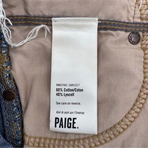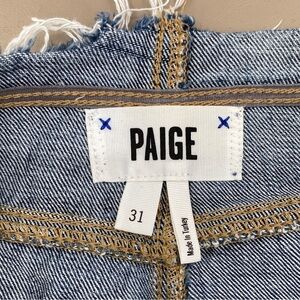 Paige denim - a brand known for its high-quality denim products. The skirt has a traditional five-pocket design, a zip fly with a clasp closure, and a straight silhouette. It also has a raw, frayed hem, giving it a slightly distressed look.