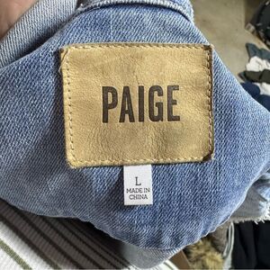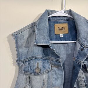 Gently worn women's size large PAIGE Denim LIght wash raw edge hem jean vest. Button closure, adjustable waist, chest pockets. Please review all photos for any signs of wear-pictured as is. Disclaimer: Any items with any wear/staining has not been treated, and unsure of ability to remove/treat condition. Comes from a smoke free home, bundle with other items to save & minimize shipping cost.