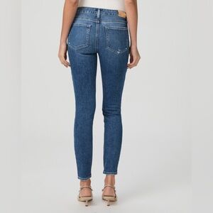 These PAIGE DENIM skinny jeans feature a sleek, tapered fit in a classic blue denim color. The uniform shade and slight sheen of the fabric add a touch of sophistication to your everyday look. Perfect for pairing with any top, these jeans offer both style and comfort.