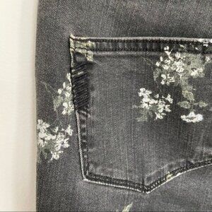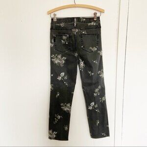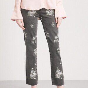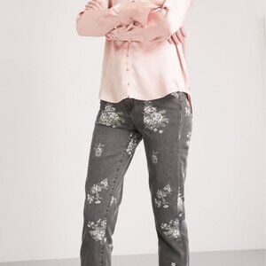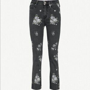 Straight, high-rise, faded wash, belt loops, five pockets, branded hardware, all-over floral pattern, branded leather patch at back waistband, v-shaped yoke at back, raw hem