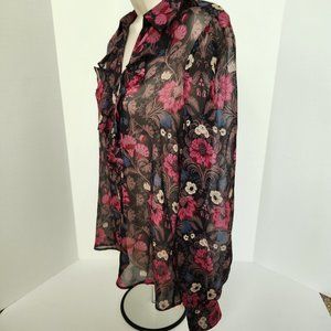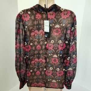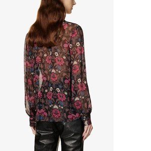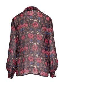 This gorgeous long-sleeve blouse with floral pattern in wintery hues is crafted from 100% silk georgette with a crinkle texture and features a collar, ruffle detailing at the neckline, and covered buttons.