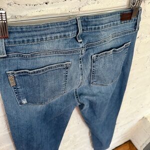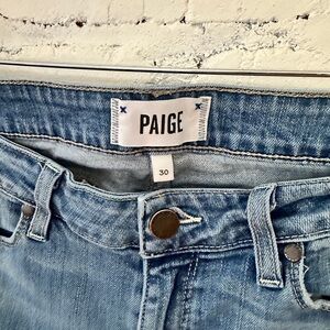 In excellent used condition, these PAIGE Verdugo ankle skinny jeans feature a flattering fit, versatile light-to-medium wash, and subtle distressed details on the outside. A perfect everyday pair that works with sneakers, heels, or boots.