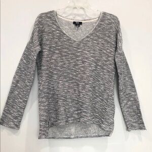 V-neck. Long sleeves. Drop shoulder design. Allover textured slub knit construction. Black & white slub. Side split hem.