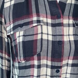 EUC - PAIGE - Super soft and fits true to size. Point collar, button down front closure and flap button chest pockets. Long sleeves with button cuffs in a madras plaid pattern of blue, white and burgundy. Size women's small