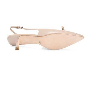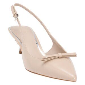 flare heel, slingback strap with buckle and goring for stretch, leather lining, bow accent, comfort footbed