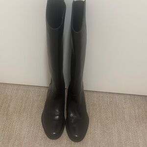 Color: Black cushioned footbed, traction sole, smooth finish, seam detail, low block heel 1.25in. heel knee high boots - For reference I am 5'8 and they hit right below knee cap! Approx 16 in height.