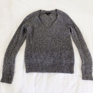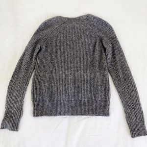 A slouchy rib-textured sweater is knit from soft metallic yarn for a luminous sheen.
