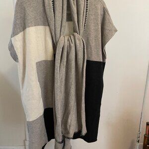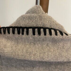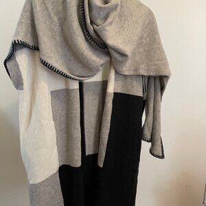 VERY soft, long, open cardigan with color block style. Can be worn open, tied or tossed. 55% nylong, 30% Wool, 15% acrylic.