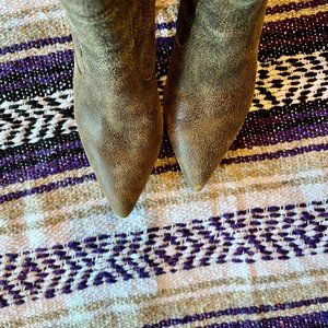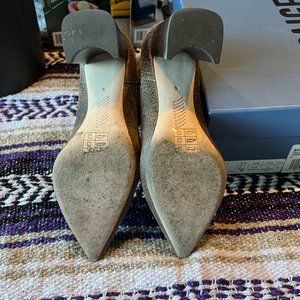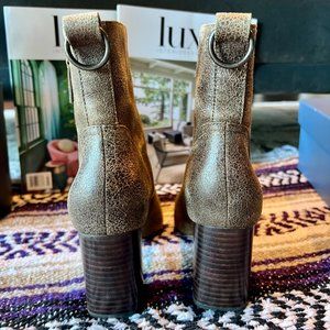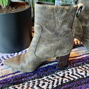 A pointy toe and block heel add contemporary style to this poised, versatile bootie. Features a 3" heel, side zipper closure and side seam details. Leather upper, lining and sole. Crafted from authentic leather with a vintage look. Great condition. Size 6.