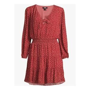 Sandee is the perfect day-to-night dress. This three-quarter sleeve mini dress features a bright papaya hue with an ikat print and a metallic gold clip dot. Design details include a tie front detail, a feminine v-neckline, smocking at the waist and a flirty tiered skirt.
