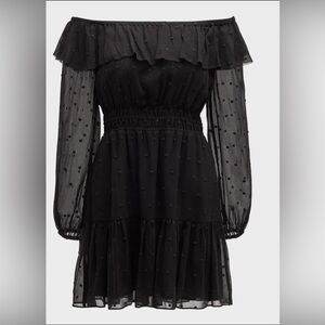 A frilly shoulder-baring neckline tops this lightweight silk dress designed in allover clip dots with sheer sleeves and a ruffled hem. 28" center front length (size 8) Off-the-shoulder neck Long sleeves Lined, except sleeves 100% silk Dry clean Imported