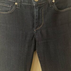 Size 27. Very good condition. Some light puckering on front. See photos. Priced accordingly. Some Very very light fading - mostly around seams and waistband. Some of the closer up photos make the jeans look lighter than they are due to the lighting conditions. They are a rich dark denim - more like the far away shots.5 pocket zip front style. Approximate measurements taken when laying flat (cannot guarantee fit):
