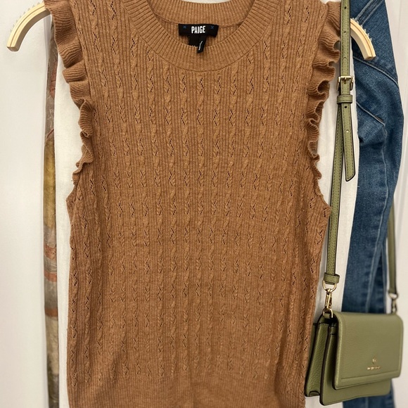 This PAIGE tank top in a warm tan hue features a ribbed texture and charming ruffled edges, offering a stylish and versatile addition to your wardrobe.