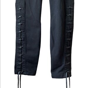 Showcasing a romantic, lace-up detailing that gracefully stretches from the ankle to the high knee, this jean is designed with a slim fit and delicate charm.