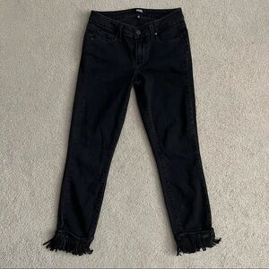 PAIGE Verdugo Ankle Skinny in ‘Yuna Black’ Faded Wash with Leather Fringe Hem