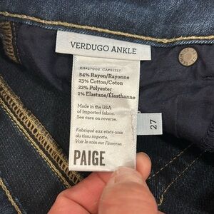 The Paige transcend Verdugo Ankle Mid Rise Ultra Skinny Jeans are a comfortable and stretchy pair of jeans for women. They are made of a blend of polyester and cotton, and have a dark Nottingham wash. The jeans have a mid-rise waist and a regular fit, with a size of 27. They feature pockets and are ankle-length.