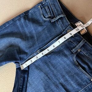 • Zip fly with button closure, five-pocket silhouette, mid-rise