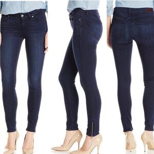 Nice dark blue wash denim skinny jeans by Paige. These are the Verdugo Ankle jeans. They have a zipper detail at the bottom of the legs. Pockets and belt loops. Color is Amelia. Great preowned condition. Women’s size 26 (2).