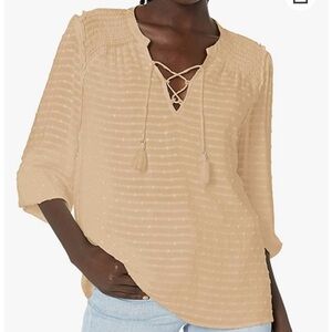 It's all in the details when it comes to the Shaylene Top. Crafted in a breezy viscose with a horizontal stripe and swiss dots woven within the fabric, this textured blouse is effortlessly chic. Detailed with a ruffle detail at the shoulder, a lace-up neckline, tassels and smocking, this three-quarter sleeve top pairs perfectly with anything from denim cut-offs to 70's inspired wide legs.