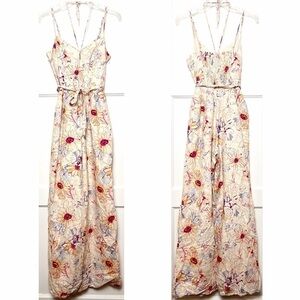 -This jumpsuit from cult denim brand PAIGE is an elegant summer essential. Lightweight and loose, it's crafted from a gorgeous cream painted sunflower-printed soft linen and cotton-blend fabric for a relaxed, wide-leg silhouette featuring a strappy bodice and ties at the waist for a cinched finish. This vacation-ready jumpsuit is the must-have one-piece of the season.
