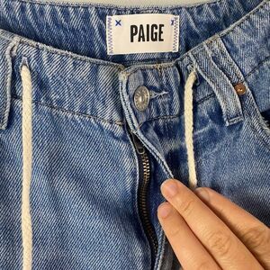 Step out in style with these chic and comfortable PAIGE Zoey Wide Leg Jeans in a versatile light-to-medium blue Coastline wash. Featuring a unique drawstring waist tie detail and a flattering high-rise and ankle-length wide leg cut, these jeans offer a modern, relaxed fit with a nod to 90s vintage denim.