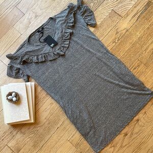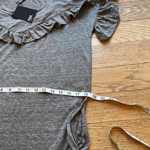 NWT. Cute heather grey dress with ruffles on front, back and sleeves. Has 2 pockets and is a relaxed style. First and last 3 photos are stock photos. See photos for measurements. Listing is for dress only.