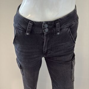 Zip fly with double button closure, a cargo pocket at each leg, black logo hardware and a slight flare. In very good condition.