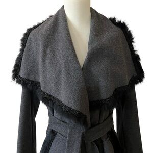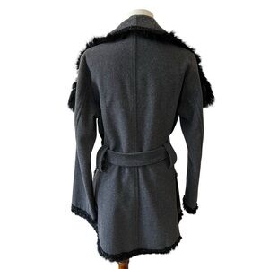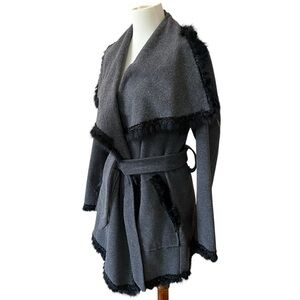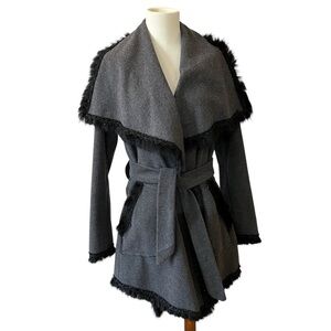 Gray with black trim, beaded for an elegant, formal holiday look, 80% wool, 20% cashmere, Italian made, elegant, warm, cozy, open front, belted at waist, shawl collar, pockets. Painc’s, wool and cashmere coat, shawl collar, women’s outerwear, luxury fashion, tailored fit, elegant design, soft fabric, warm and cozy, classic style, sophisticated, timeless, long coat, winter wardrobe, versatile, premium quality, polished look, minimalist, statement piece, chic, cold-weather essential.