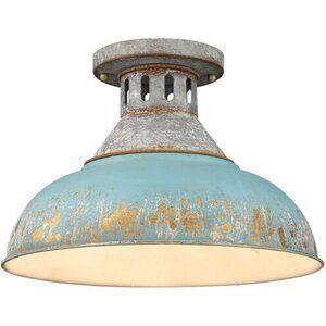 New in box 14" Golden Lighting weathered, galvanized steel open shade for ceiling light. Hand painted and aged, green, cream and gold.