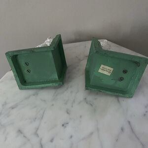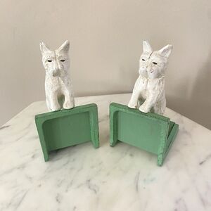 Add a touch of whimsy to your bookshelf with these beautifully detailed sturdy bookends featuring a delightful WHITE WESTIE on each side, standing on hind legs with front paws resting upon a green wall. Each side measures approximately 6 high x 5 long x 3 wide. Hand painted antiqued finish, distressed