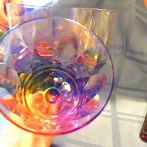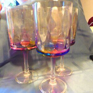 From first sip to last drop, you are certain to savor the taste of your favorite vino with the set of2 rainbow geometric acrylic stemmed all purpose wine glass. Beautifully machine embossed to give your glassware a bit of design, character, and dimension. Bring a pop of personality to your kitchen or dining room with this geometric pattern. The texture on this surface not only looks great but feels cool in your hand. Every drink deserves the perfect glass, and so do you. 8.25-inch H x 3.38-inch W x 3.38-inch D 4 Piece set sells for 52.00 on eBay.