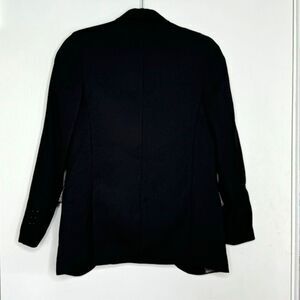 Black suit jacket, blazer featuring 2 front tab pockets, 2 interior pockets (all still stitched closed) notched lapel, 2 button closure, signature pink paisley lining, 2 back vents still stitched closed. Made of 100% polyester.