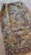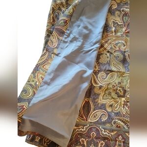 Gorgeous slate blue, sage green, burgundy and gold print 100% silk wrap skirt. Flattering fit; breathable natural fiber. Buttons and snaps on the inside; one exterior button at the side is missing and will need to be replaced (priced accordingly). Fully lined.