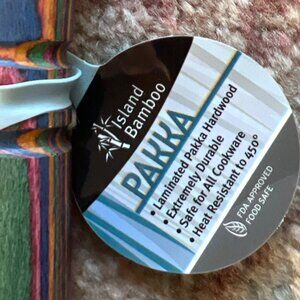 This is for a new kitchen cooking utensil. It is Island Bamboo brand and it is Pakka. It is laminated Pakka hardwood that is extremely durable and safe for all cookware. Heat resistant to 450 deg.