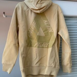 Light yellow thick hoodie. One small mark underneath the left breast logo. Phot shown. Measurements shown.