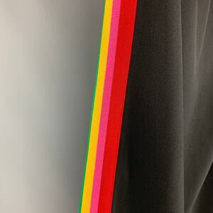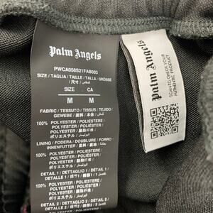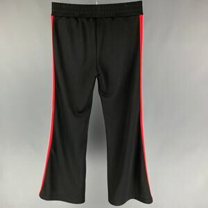 PALM ANGELS casual pants comes in a black polyester featuring flared style, multi-color stripe trim. zipper pockets, and a elastic waistband.