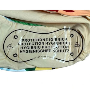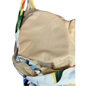 New Without Tags Palms Away Floral One Piece Swimsuit, tie belt, hibiscus flowers in orange, yellow, blue, and white with touches of purple and green, lightly padded cups, adjustable straps, hygiene sticker attached, women size extra small.