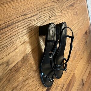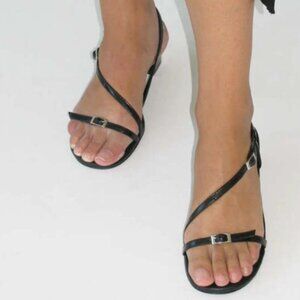 Black Mara leather sandal in black with silver buckle detail. Excellent used condition, minimal signs of wear. Sell for $268 but currently sold out. Beautiful chic minimalist y2k 90's black strappy block heeled wrap around sandal. Great for casual or wedding guest attire. Made in Spain. Look like they were never worn, still have protective stickers on soles.