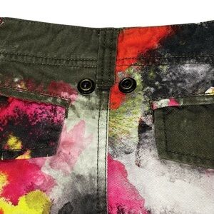 Add a pop of color to your summer wardrobe with these standout cargo shorts by designer Pam & Gela. Made from ultra-soft, lightweight fabric, these army green shorts features a striking watercolor floral print in bright pink, orange and yellow ---balancing edgy and feminine vibes perfectly. Designed with a front zip and snap button fly, two front pockets and two back snap button flap pockets, plus subtle back vent holes for breathability. Stylish, yet functional, these are the perfect statement shorts for sunny days, music festivals, or casual weekend outings.