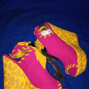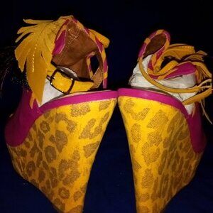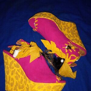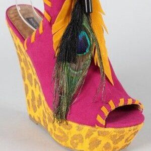 Pampi Two Tone Peacock Leaf Peep Toe Wedge. Display your playful side when you rock in these wild peep toe wedges! It features faux suede upper with leaf and peacock feather embellishment, contrast whip stitching details, leopard print platform, and wedge heel. Finished with padded insole and adjustable ankle strap with buckle closure. material: faux suede. colors: fuchsia .