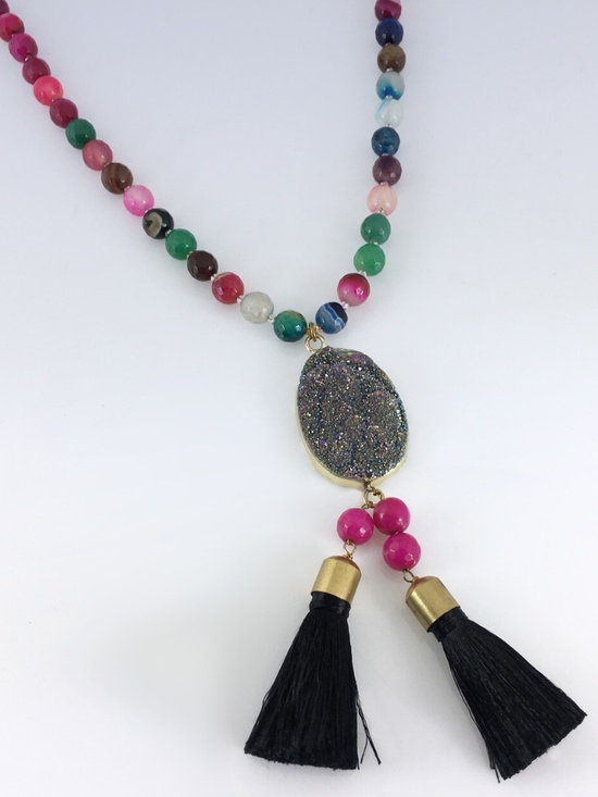• Polished magenta and multi colored agate beaded necklace is highlighted with an egg-shaped druzy stone and two swinging black tassel pendants