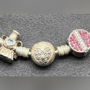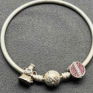 PANDORA 9.25 Silver stamped VINTAGE 7.25" Bangle Charm Bracelet 3 charms