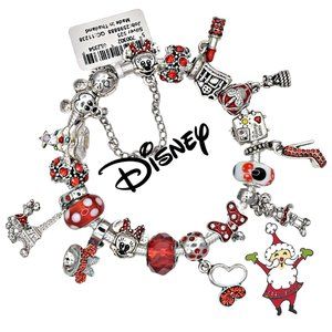 PANDORA BRACELET WITH DISNEY MINNIE 19 RED THEMED CHARMS NEW