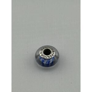 The PANDORA "Blue Candy Stripes" #790611 charm features blue Murano glass bead with silver accents. This handmade charm is signed by PANDORA and has a vintage style, making it a unique addition to any bracelet or charm collection. With its stackable design and retired status, this charm is sure to stand out and add a touch of charm to any jewelry ensemble. Made in Thailand, this undated piece is perfect for those who love blue glass jewelry with a touch of nostalgia. It is in excellent condition. It is stamped 925 and ALE.