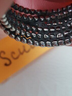 This ring is one complete piece that appears to be a number of beaded partially oxidized sterling silver strands overlapping each other, and is highlighted with 14K gold and diamonds.