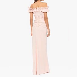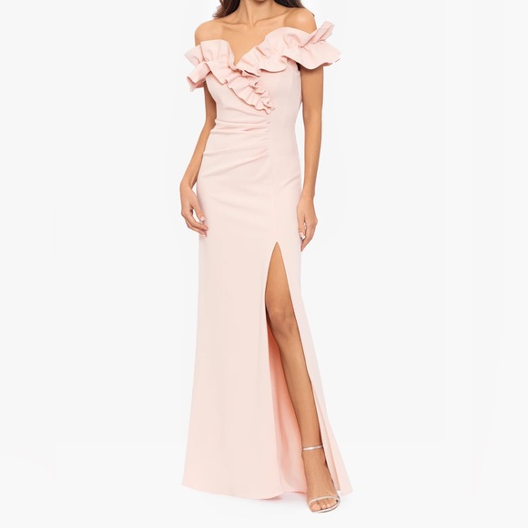 Details: Off the Shoulder, Side and Back Ruche, Ruffle Top, Full Length Gown