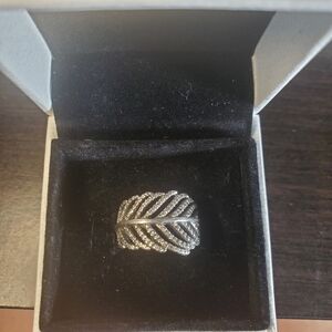A stunning sterling silver feather ring adorned with cubic zirconia gemstones. This ring is part of the Feather collection. Size 5